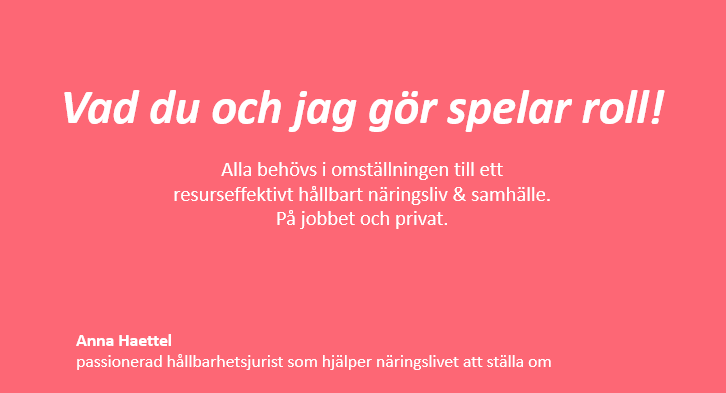 "Vad du och jag gör spelar roll - på jobbet och privat" - föreläsning utifrån juridiken och cirkulär affärsutveckling som får med personalen och andra intressenter på ert tåg mot ett mer hållbart näringsliv och samhälle.